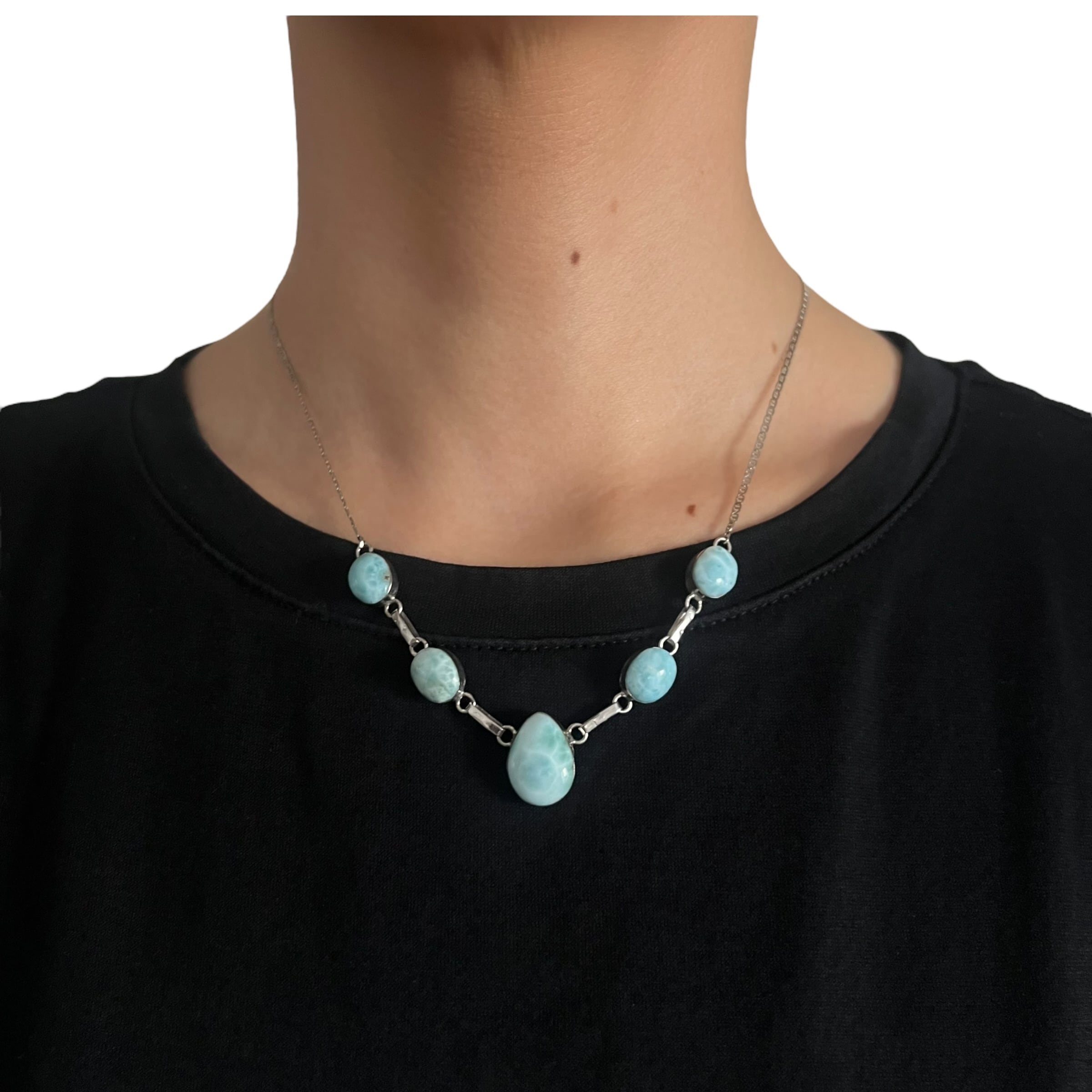 天然石ラリマー(キューバ産)大1.5㎝小0.8㎝ サージカルステンレスチェーン 45㎝